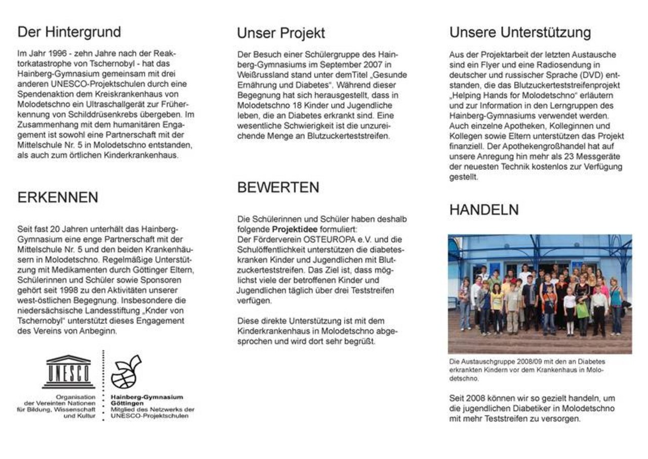 - Projektanbindung des Austausches: " 20 Jahre Weißrusslandaustausch- Miteinander, voneinander lernen und Feste feiern - Erfahrungsmöglichkeiten für gesunde und diabetes - kranke Jugendliche"