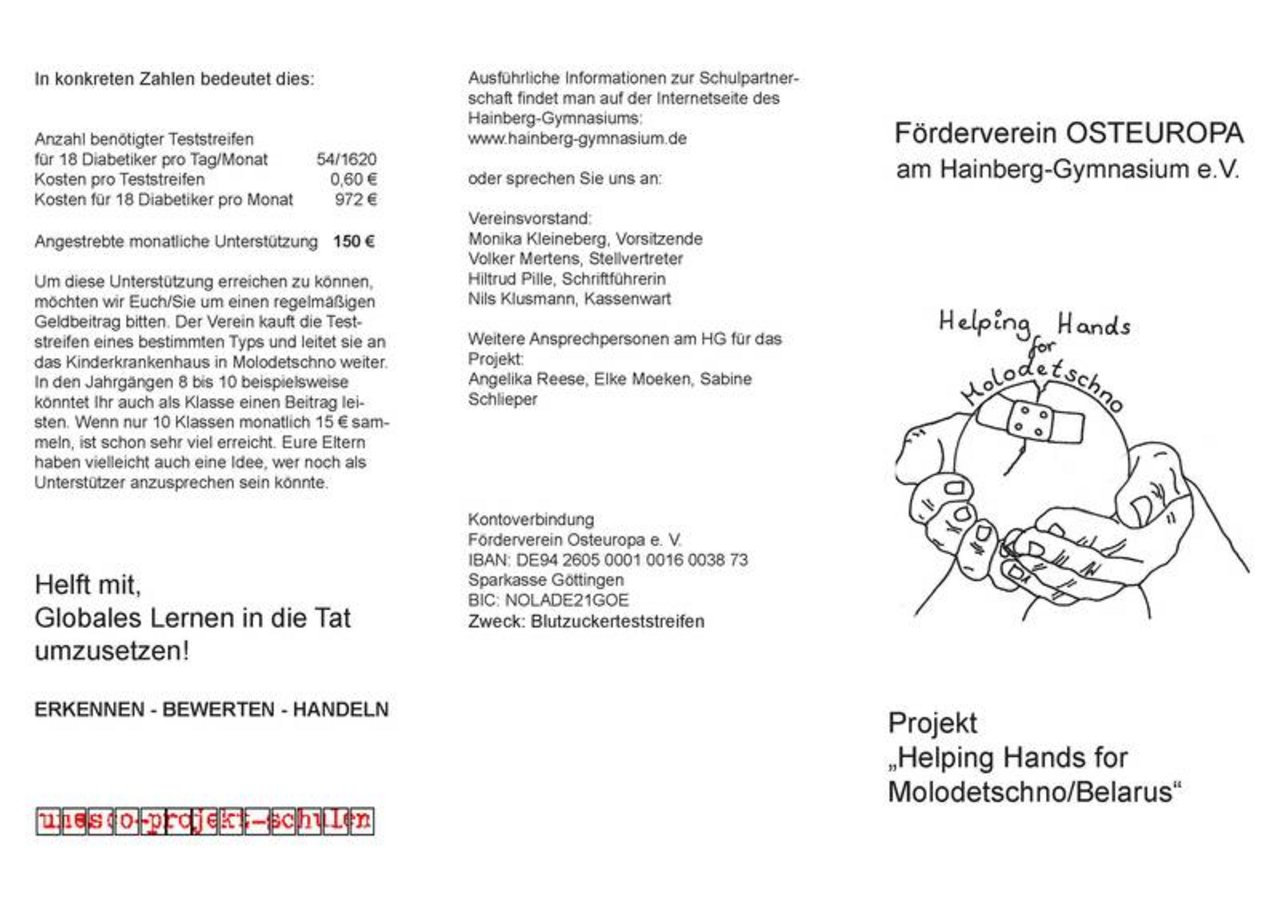 Seit 1998 unterstützt das Hainberg-Gymnasium das Rayonkrankenhaus in Molodetschno zusätzlich mit dringend benötigten Medikamenten und Geräten im Rahmen einer durch Selbstverpflichtung entstandenen Medikamentenpatenschaft. Seit 2008 unterstützt das Hainberg-Gymnasium zusammen mit dem Förderverein OSTEUROPA e.V. im Rahmen des Projekts "Helping Hands for Molodetschno" die 18 an Diabetes erkrankten Kinder in Molodetschno mit zusätzlichen Blutzuckerteststreifen.