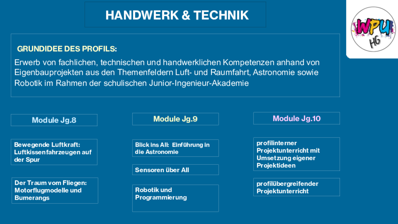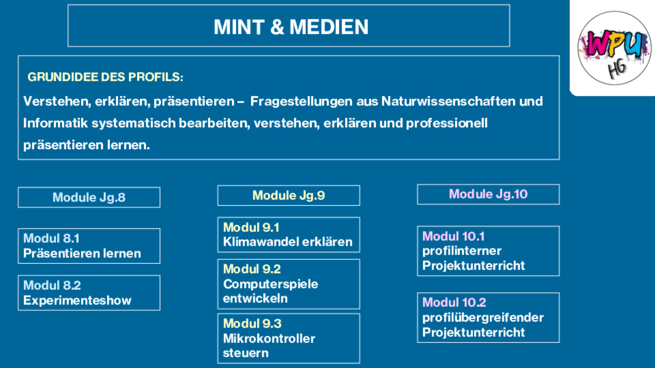 Der WahlPflichtUnterricht findet in den Jahrgängen 8 -10 statt. Er bietet den Schüler:innen die Möglichkeit, individuelle Schwerpunkte zu setzen und wird klassenübergreifend in Kursen erteilt.