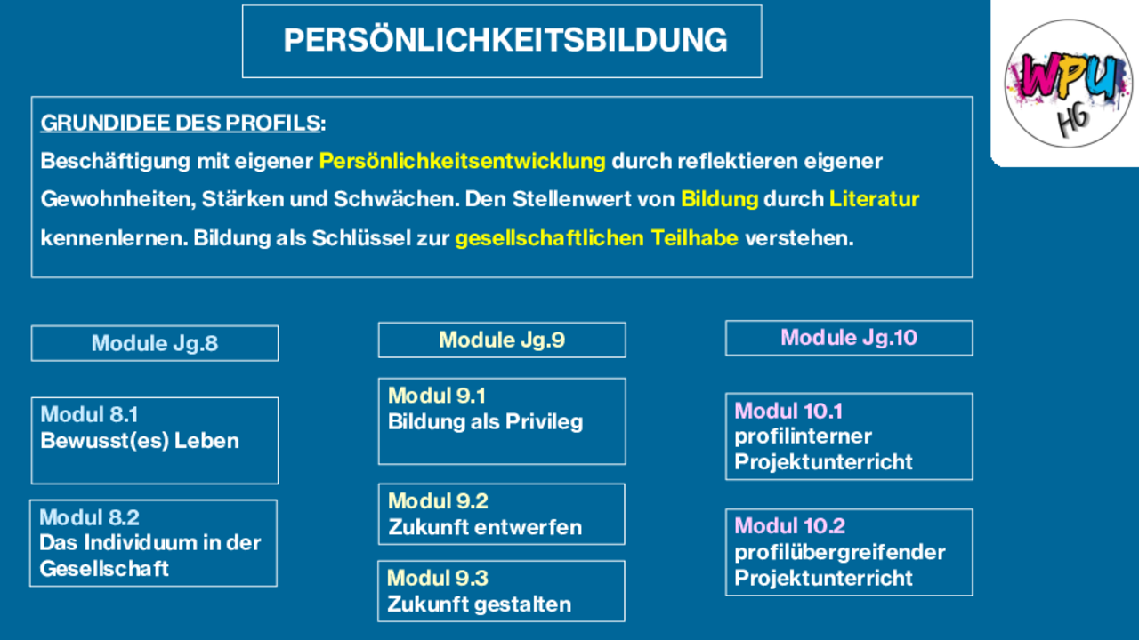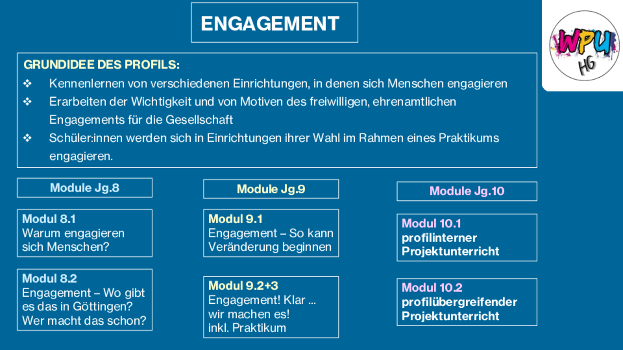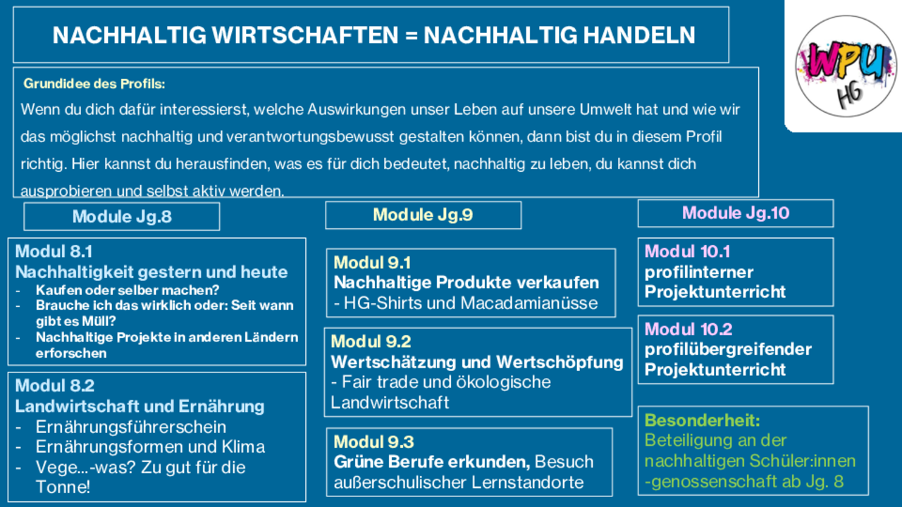 Ab dem Schuljahr 2026/2027 wird der Wahlpflichtunterricht am Hainberg-Gymnasium aufsteigend zunächst für Jahrgang 8 in fachübergreifenden Profilen angeboten, die an die Grundideen der Unesco-Säulen anknüpfen. Schwerpunkt der Arbeit im WPU ist, auf der Basis eines gemeinsam erarbeiteten inhaltlichen Fundaments zunehmend selbstständig in Projekten zu arbeiten. Die Lernenden werden Stück für Stück an die Methode der Projektarbeit herangeführt. Zielsetzung ist, den Unterricht an die aktuellen Gegebenheiten und Bedürfnisse anzupassen: Sinnvolle Nutzung von KI; Förderung der Teamarbeit, kreativer Entwicklungsprozesse, Produkterstellung und begleiteter Evaluation der Prozesse. Wir hoffen damit und durch die Zusammenarbeit mit außerschulischen Partnern, die Lernenden im Kleinen auf zukünftige Lern- und Arbeitssituationen vorzubereiten.