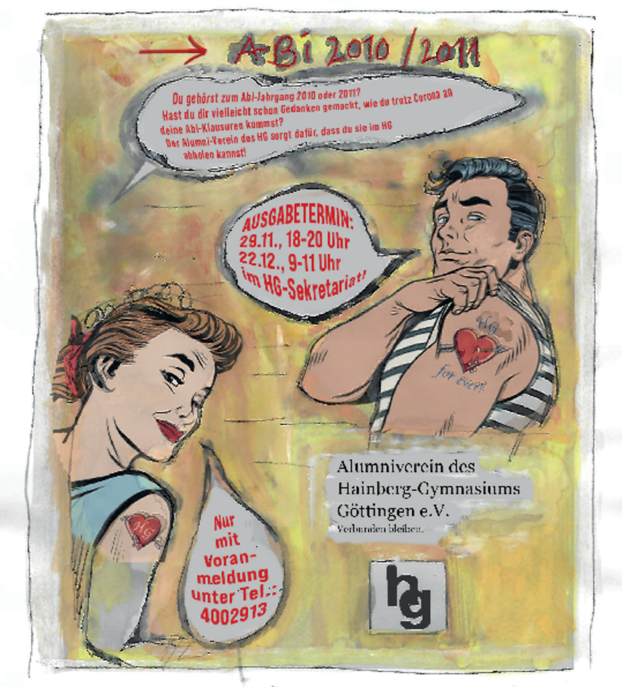 Der Alumniverein und das Sekretariat des HG bieten an, dass die Abi-Jahrgänge 2010 und 2011 ihre Abi-Klausuren abholen können. Dazu gibt es 2 Termine, zu denen man sich aber jeweils anmelden muss - Näheres findet sich auf dem fetzigen Poster in der Anlage!