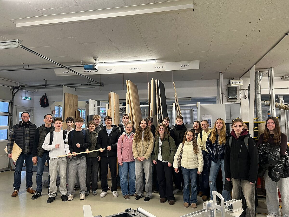 Der Besuch der Tischlerei hat Eindruck auf den WPU-Kurs „Werk-Raum“ gemacht. Die Produktionsräume sind freundlich, hell und sauber. Die Maschinen sind modern und die benötigte Energie wird sowohl aus Solarenergie als auch aus selbst produzierten Pellets der Resthölzer generiert. Der Inhaber des Familienunternehmens führt uns durch den laufenden Betrieb, ohne dass wir das Gefühl haben zu stören. Er vermittelt uns einen umfangreichen Einblick in die Arbeitsschritte von der Platte bis hin zur einbaufertigen Küche. Neu für die Gruppe ist die Erkenntnis, dass es sich im Handwerk nicht mehr nur um handwerkliches Geschick handeln kann, sondern auch um technisches Verständnis z.B. der komplexen CNC-gesteuerten Geräte. Teamarbeit und Kundenkontakt runden das Berufsfeld des Tischlers ab. Das, was wir mit unseren neuen Maschinen und Werkzeugen in der Schule „ausprobieren“ können, erleben wir hier unter professionellen Berufsbedingungen. Herr Welling nimmt sich Zeit für uns und geht auf alle Fragen des Kurses ein - nicht ohne am Ende ein Lob an die interessierte Gruppe zu platzieren.