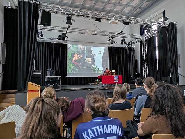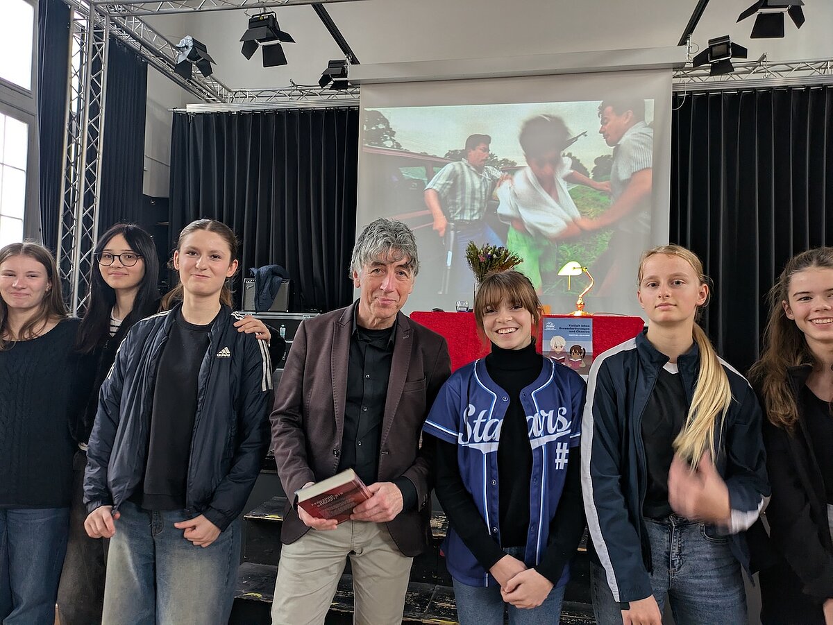 Der aktuell mit dem Jugendliteraturpreis in der Kategorie Jugendjury ausgezeichnete Autor beginnt seinen Besuch bei uns mit einem eindrucksvollen Foto-Vortrag zu den Recherchen für seinen Roman. Dazu begab er sich selbst nach Mexiko und erkundete vor Ort eine der weltweit gefährlichsten Flüchtlingsrouten in die USA. Es seien vor allem viele Jugendliche aus Süd- und Mittelamerika, die sich auf die Suche nach ihren in den Vereinigten Staaten arbeitenden Müttern begäben und sich deshalb der lebensgefährlichen Reise auf Zugdächern aussetzen würden. Mit den Jugendlichen habe er vor Ort sprechen können, sie berichten lassen, ihnen habe er einfach zugehört. Entsprechend lenkt Dirk Reinhardt dann auch in seiner Lesung aus "Train Kids" unseren Blick. Erzählt wird aus den Perspektiven von fünf Jugendlichen, die sich an der Grenze zu Mexiko am Rio Succhiate zusammenfinden und nun gemeinsam den Weg in den Norden antreten, ein Weg, auf dem sie nicht nur einmal ihr Leben riskieren werden. Interessiert lauschen wir der Stimme Reinhardts, sie entführt uns in das Leben der Kids, sowohl beklemmend als auch Mut machend.