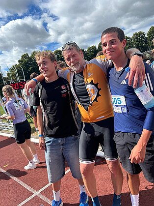 Das Hainberg Gymnasium belegt bei der Schulwertung des diesjährigen Göttinger Volkstriathlons den dritten Platz. Nach 500m Schwimmen, 20 km Radfahren und 5 km Laufen waren 27 Finisher, davon 6 Staffeln und acht Einzelstarter*innen im Ziel (eine Starterin wurde leider nicht erfasst). Bei hervorragenden Bedingungen wurde in der angenehm lockeren Atmosphäre des Jahnstadions abgeklatscht, gratuliert und über den Rennverlauf gefachsimpelt.