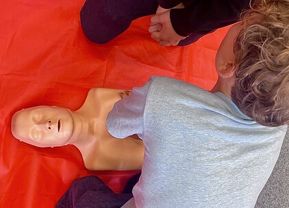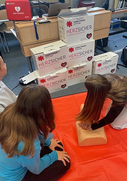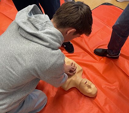 Während der „Woche der Wiederbelebung“ im September konnten wir über 100 Schüler*innen in Wiederbelebungstechniken schulen. Auch der Umgang mit unserem neuen AED wurde trainiert. Unser Ziel ist es, alle Schüler*innen ab Jg. 7 zu schulen, so dass die Reanimation nach dem Schema „Prüfen, Rufen, Drücken“ im Notfall sicher angewendet werden kann. Bei Fragen wenden Sie sich gerne an unseren Erste-Hilfe-Beauftragten: f.reitzenstein@hg-gym.de.